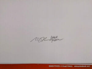 We signed for hours, he and I. Charles AKA Black Francis was involved with a lot of press and interviews, so we would not get to sign with him, but the plan was to have a courier take the 4 boxes to the hotel where Charles was staying, and he would sign there. After 4 hours of signing endsheets, Aaron and I had to stop and get ready to go to the Pixies show.