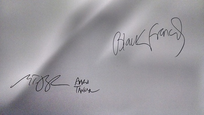 As you know, Black Francis, myself, and Aaron Tanner did a lot of signing for this project, something like 3500 copies. Since Black Francis was on tour with the Pixies, and Aaron is in Indiana, and I am in New York, it was a logistical challenge to get all 3 of us in one place at the same time to sign a massive pile of books. It was not going to happen.  So the solution was to sign the actual pages of paper that would make up the end pages of the book. That way we are working with a few cases of (very large and very heavy) paper, instead of a massive pile of 9×12 books. Even with this solution it was still a challenge. We started signing in the tiniest hotel room in NYC, back in September, when the Pixies were playing a run of shows there. The place was so small, Aaron and I could not even be in the same room to sign, there wasn’t enough space! I sat on a bed signing, and he was standing in the tiny kitchen at the counter.  But we made it work. Then it came time to have Black Francis sign. This was a bit more challenging. After a few aborted attempts, we found a block of time in December that worked, and I drove up to Massachusetts and we signed at his office. This was an intense two day process, and I really thank him for making it work.